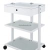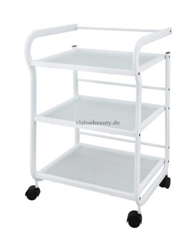 Wagen mit weissem metallischem Rahmen in minimalistischem Design. Es verfügt über 3 Etagen und die offene Frontseite macht es perfekt für Geräte mit Fernbedienung oder Ausgänge auf dem vorderen Teil. Uneingeschränkte Bewegung dank seiner 4 Räder und seiner Henkel im hinteren Teil des Wagens.