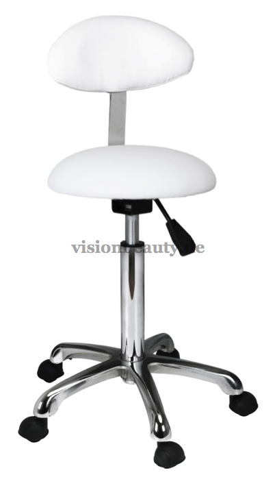 Bequemer Hocker mit Rückenlehne in elegantem Design. Der Sitz ist halbkugelförmig und die Höhe wird mittels Gasdruckfeder reguliert. Chromfuß mit 5 Rädern.