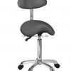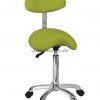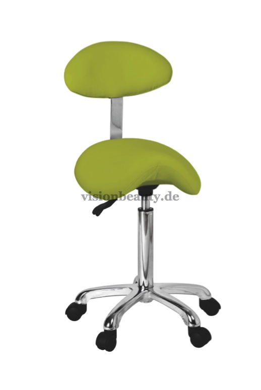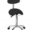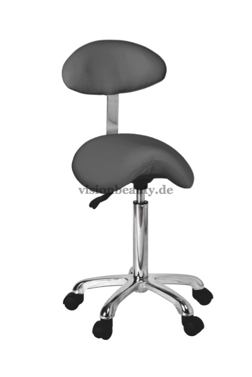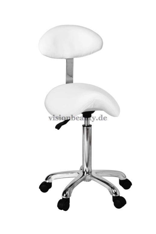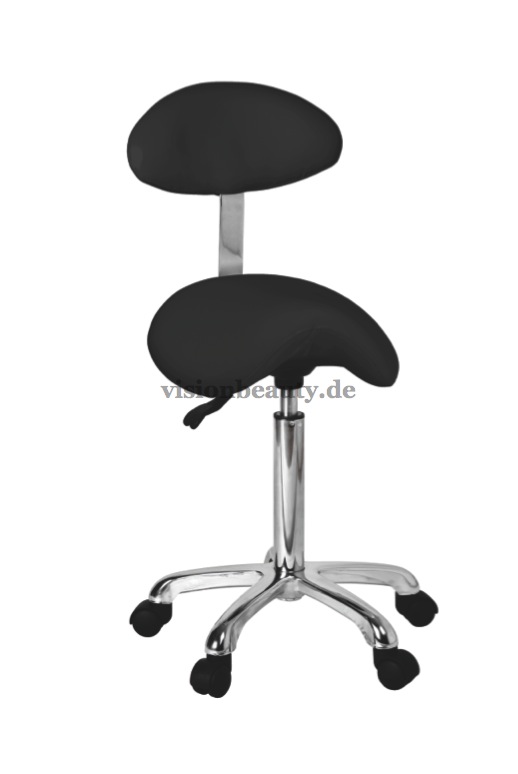 Sattelhocker mit Rückenlehne und einem ergonomischem, bequemem und elegantem Design. Die Höhe kann mittels Gasdruckfeder verstellt werden. Hochwertige PU-Polsterung und verchromter Basis mit Rädern.