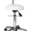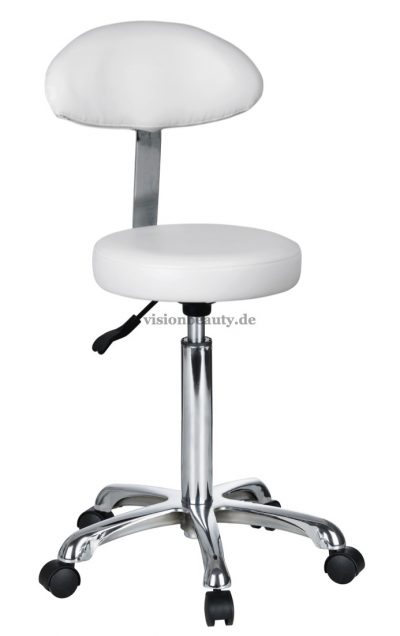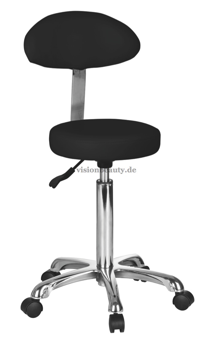 Bequemer Hocker mit Rückenlehne und flachem Sitz in elegantem Design. Die Höhe kann mittels Gasdruckfeder verstellt werden. Hochwertige PU-Polsterung und verchromte Basis mit Rädern.
