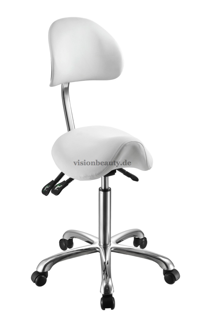 Sattelhocker mit Rückenlehne und einem ergonomischem, bequemem und elegantem Design. Die Sattelform gewährleistet maximalem Komfort für die Profis. Die Höhe (mittels Gasfeder) und die Neigung des Sitzes und der Rückenlehne können durch drei Handhebel reguliert werden. Hochwertige PU-Polsterung. Chromfuß mit 5 Rädern.