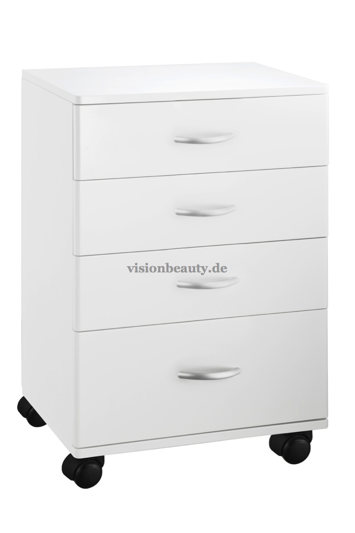 Eleganter und moderner Kosmetikwagen aus Holz, weiß lackiert. Der Wagen ist mit 4 Schubladen ausgestattet und 4 Rädern um die Verschiebung zu vereinfachen. Besonders geeignet für Kosmetikstudios.