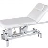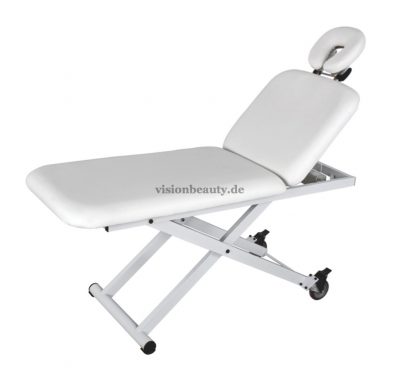 Sehr stabile multifunktionale Liege, 2 teilig. Ein Motor reguliert die Höhe und die Neigung der Rückenlehne kann mechanisch verstellt werden. Regulierbare Kopfstütze mit Gesichtsausschnitt. Metallische robuste Struktur mit 2 Rädern um die Verschiebung zu vereinfachen. Hochwertige weiße PVC-Polsterung, leicht abwaschbar.