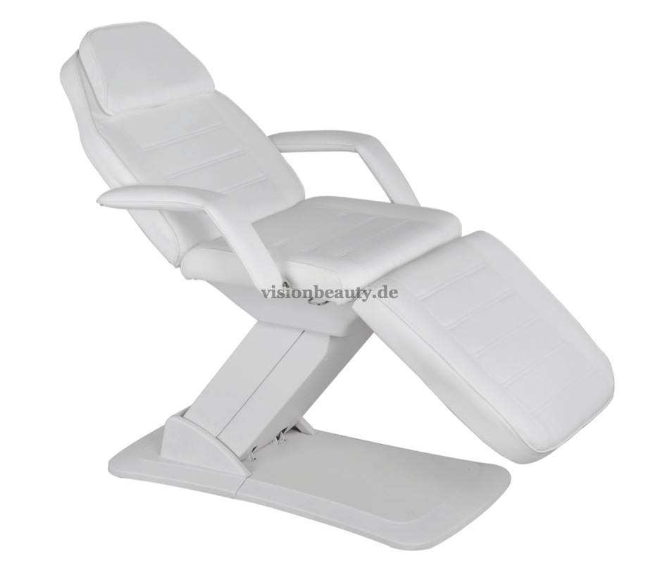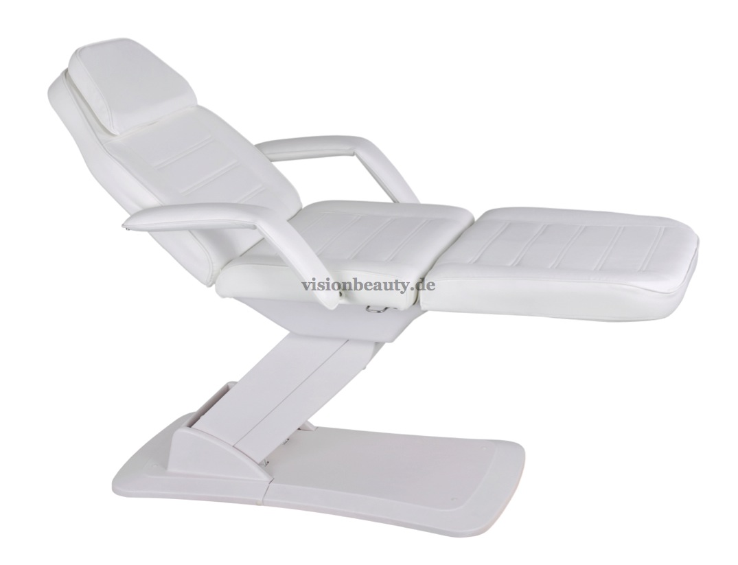 Funktionelle Behandlungsliege, sehr stabil, 3-teilig mit 3 Motoren um die Höhe, die Neigung der Rückenlehne und die Neigung des Fußteiles einzustellen. Ausziehbare Armlehnen und ausziehbare Kopfstütze mit Gesichtsausschnitt. Hochwertige weiße PU- Polsterung, leicht abwaschbar.