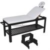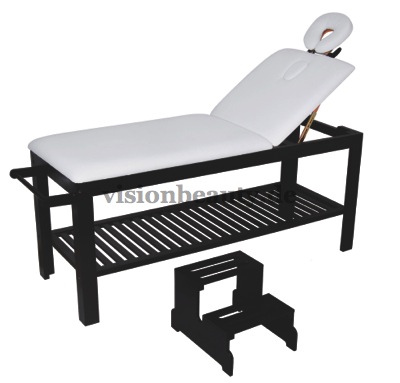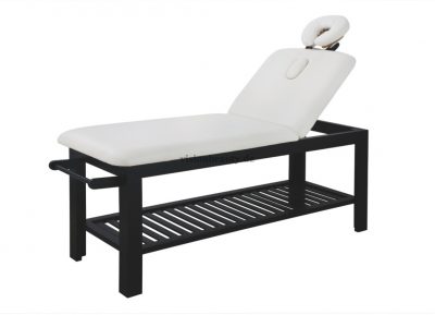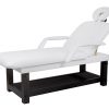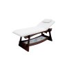 Stationäre2-teilige Liege mit einem robusten und sehr stabilem Holzrahmen in Wenge Farbe. Die Neigung der Rückenlehne kann mittels Gasdruckfeder verstellt werden. Regulierbare Kopfstütze und Gesichtsausschnitt. Hochwertige weiße PVC- Polsterung, leicht abwaschbar.