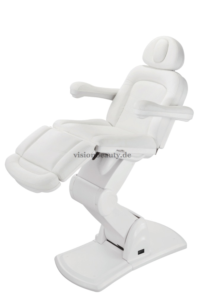 Hochwertige Liege mit sehr stabiler Struktur um maximalen Komfort zu bieten und die Höhe optimal zu regulieren. Mit 3 Motoren um die Höhe, die Neigung der Rückenlehne und die Neigung des Sitzes zu regulieren. Die Fußstütze kann mittels Gasfeder angepasst werden. Armlehnen beidseitig verstellbar und regulierbare Kopfstütze. Hochwertige weiße PU- Polsterung, leicht abwaschbar.