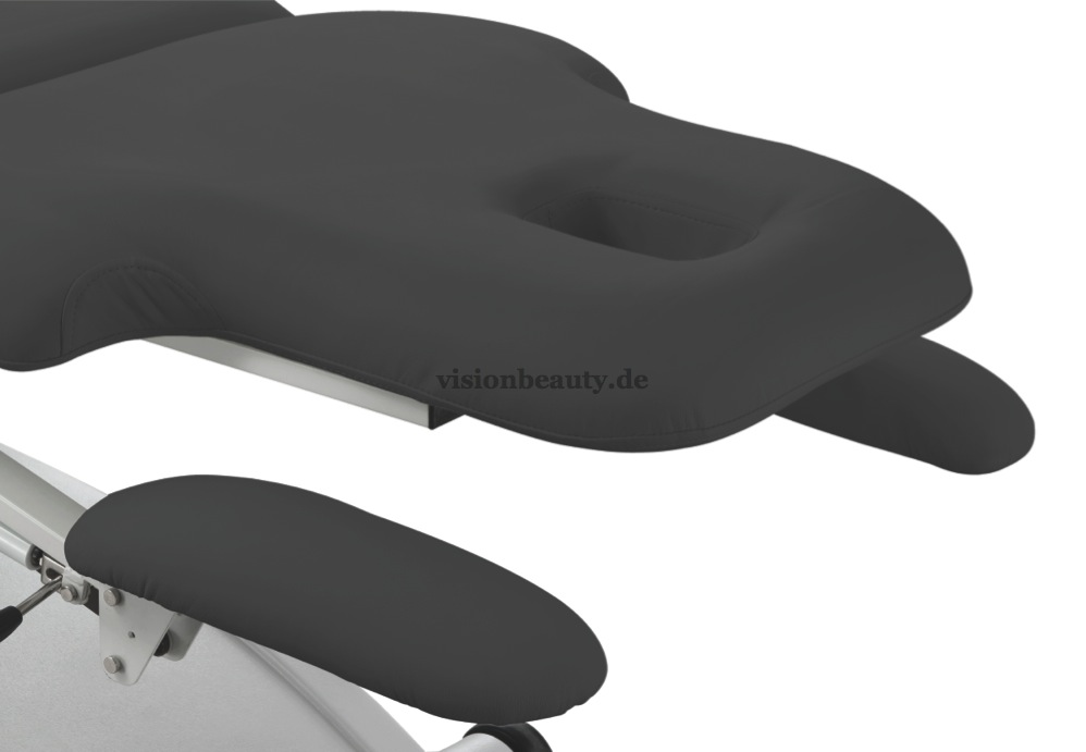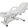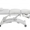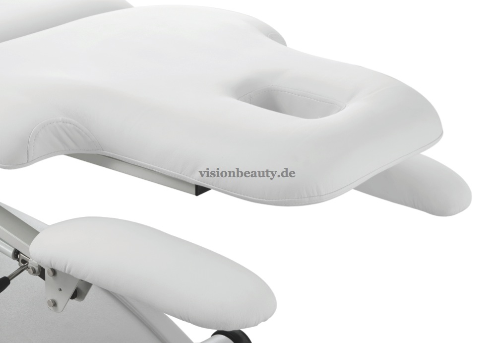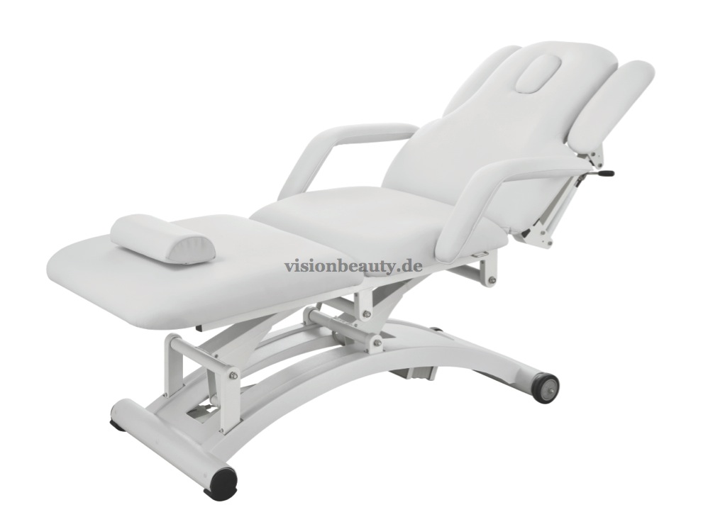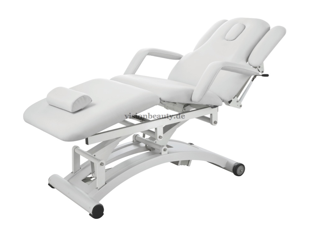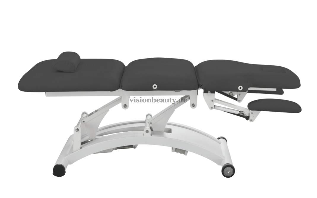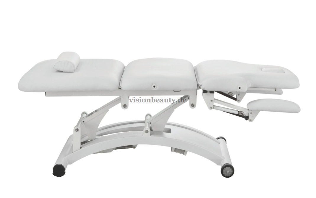 Hochwertige Liege besonders geeignet für Physiotherapie. Mit 3 Motoren um die Höhe, die Neigung der Rückenlehne und den mittleren Teil und Fußteil zu steuern. Doppel Armstützesystem: ausziehbar und in Höhe und Position regulierbar. Kopfstütze mit Gesichtsausschnitt und extra Haltungskissen dazu. Metallischer Rahmen mit klappbaren Rädern, was die Verschiebung vereinfacht. Hochwertige weiße PU-Polsterung mit hoher Dichte, leicht abwaschbar.