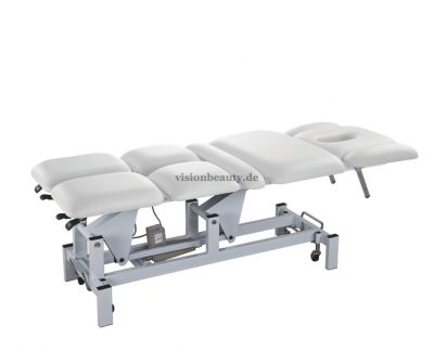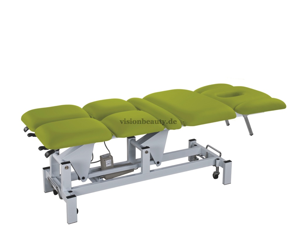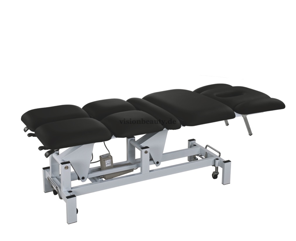 Hochwertige Liege mit Gesichtsausschnitt besonders geeignet für Physiotherapie und Osteopathie. Mit 8 Teilen, die sehr leicht viele verschiede Positionen ermöglichen. Unabhängige Beinstützen. Sie verfügt über 2 Motoren um die Höhe und die Neigung der Rückenlehne zu regulieren. Sehr robuster metallischer Rahmen mit einziehbaren Rädern, was die Verschiebung ermöglicht. PU-Polsterung und Schaumstoff mit hoher Dichte.