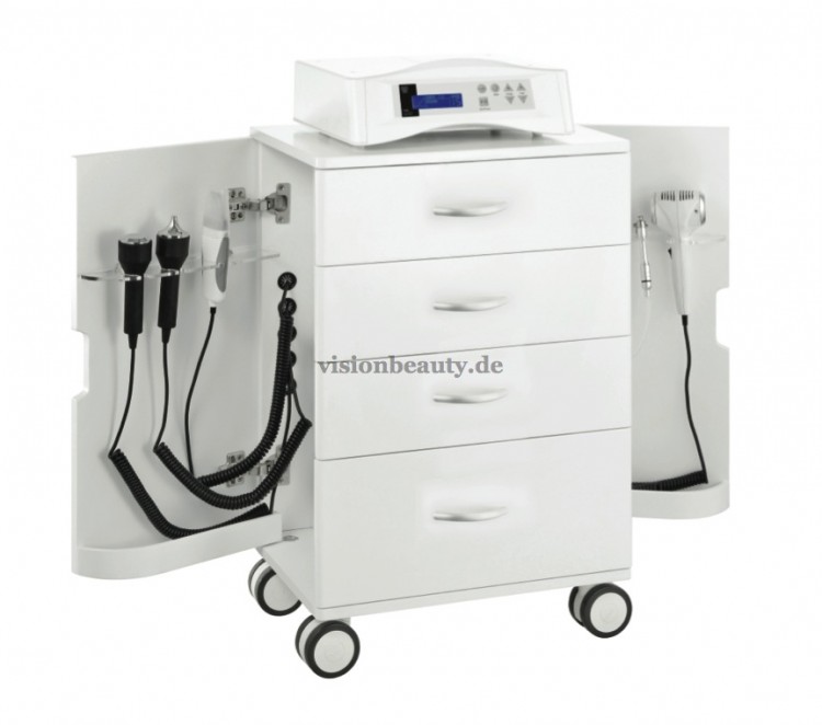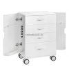 Moderner Multifunktionswagen weiß lackiert aus Holz für ein Kosmetikgerät der MultiEquipment Series. Er verfügt über 4 Schubladen und 2 seitliche Türen, um das Zubehör ordentlich zu verstauen. Voller Beweglichkeit dank 4 Rädern, der Wagen ist besonders für Kosmetikstudios geeignet.