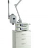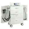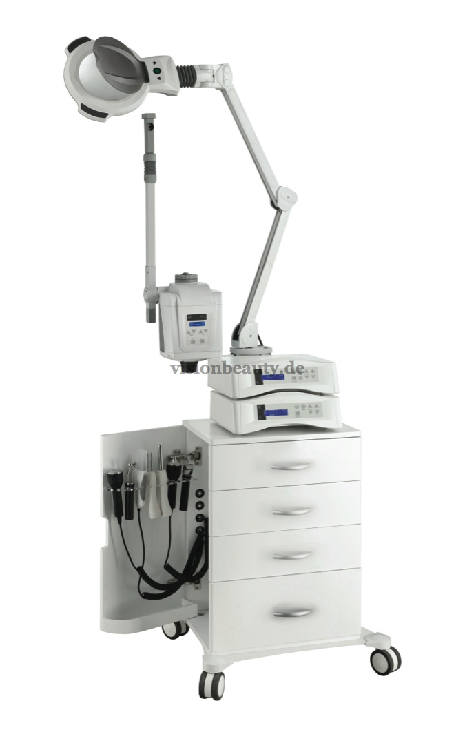Moderner Multifuktionsturm standard ausgestattet mit einem Wagen aus Holz weiß lackiert, mit 4 Schubladen und 2 seitlichen Türen, um das Zubehör zu verstauen, 5 Dioptrien Lupenleuchte (1006T) und Vapozon (F-300DT). Der Turm kann mit bis zu 2 Geräten der MultiEquipment Serie ausgestattet werden, wahlweise je nach Bedarf, und somit können bis 12 verschiedene Funktionen kombiniert werden. Basis mit 4 Rädern um die Verschiebung zu vereinfachen. Besonders für Kosmetikstudios geeignet.