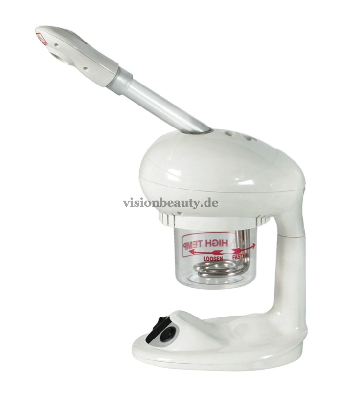 Tragbarer Bedampfer mit Ozonlampe. Weiße Plastikstruktur und Plexiglas Tank, sehr resistent. Ausgestattet mit einem Essenzbehälter und einem drehbaren Kopfstück.