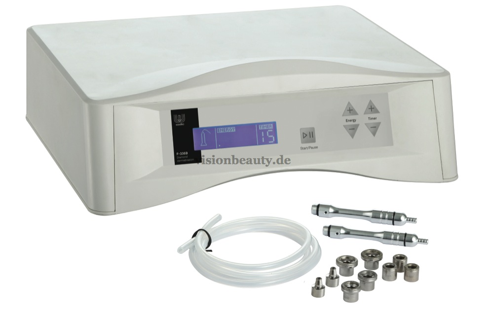 Mikrodermabrasionsgerät mit Diamantaufsätzen. Es wird verwendet um ein Peeling der Hornschicht durchzuführen. Ausgestattet mit 9 Aufsätzen und zwei Handstücke mit Vakuum System, um die toten Zellen abzusaugen.