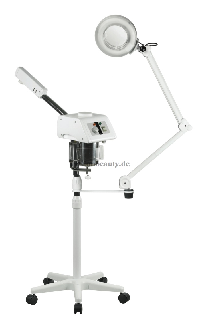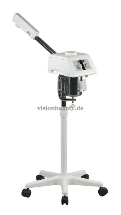 Bedampfer mit Ozonlampe. Weiß lackiertes Gehäuse. Ausgestattet mit einem Teleskoparm um die Höhe zu regulieren und einem drehbaren Kopfstück.