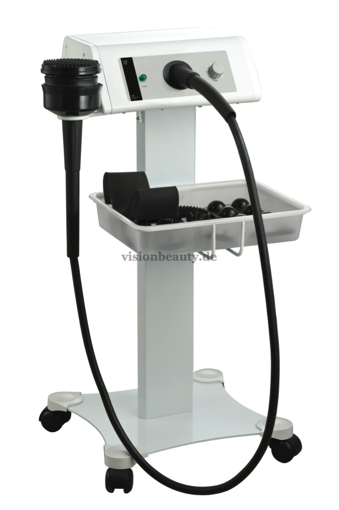 Modernes Körpermassagegerät mit 6 austauschbaren vibrierenden Köpfen. Wirkt wie passive Gymnastik. Basis mit Rädern um die Verschiebung des Gerätes zu vereinfachen.
