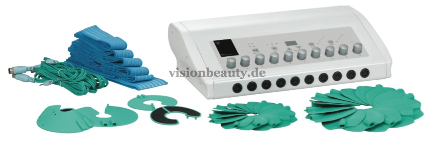Elektroden für passive Gymnastik, daß das Abnehmen erleichtet und Muskeltonus verleiht. Frontseite mit 10 Ausgängen.