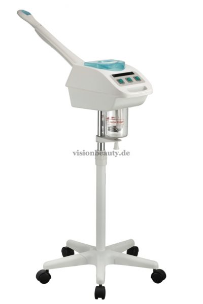 ‘Kalt-Warm’ Vapozon. Es versprüht nicht nur Warmdampf, sondern vernebelt auch kaltes Wasser, zu bedienen unabhängig voneinander. Es hat ein modernes, leichtes und funktionelles Design. Ausgestattet mit einem Teleskoparm um die Höhe zu regulieren und einem Essenzbehälter. 5 Räder-Basis um die Verschiebung zu vereinfachen.