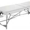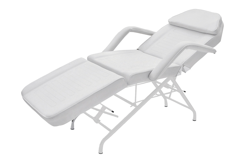 Stationäre 3-teilige Liege. Neigung der Rückenlehne und des Fussteiles unabhängig voneinander. Abnehmbare Armlehnen und Kopfstütze. Gesichtsausschnitt. Metallischer Rahmen weiß lackiert. Weiße PVC-Polsterung, leicht abwaschbar.