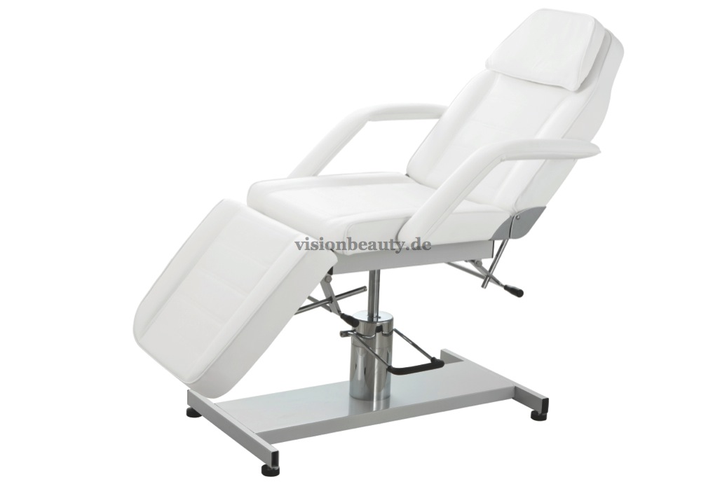 3-teilige funktionelle Liege mit Basis aus Chrom. Die Höhe kann mittels einer Hydraulikpumpe reguliert werden. Armlehnen und Kopstütze mit Gesichtsausschnitt abnehmbar. Hochwertige weiße PVC- Polsterung, leicht abwaschbar.